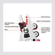 - Includes tri-hole stripper, Kevlar scissors, lint free roller wipes, drop cable stripper, and ruler