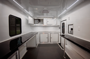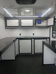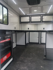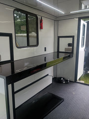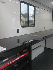 This fiber splicing trailer is built tough with 3,500 lb tandem axles, 7' interior height, and a 6" I-beam frame. Features include recessed strobe lights, USB/USB-C receptacles, LED strip lighting, AC with heat strip, overhead and under-counter cabinets, and multiple splicing doors with brush guards. Includes safety features, blackout package, and a 5-year warranty.